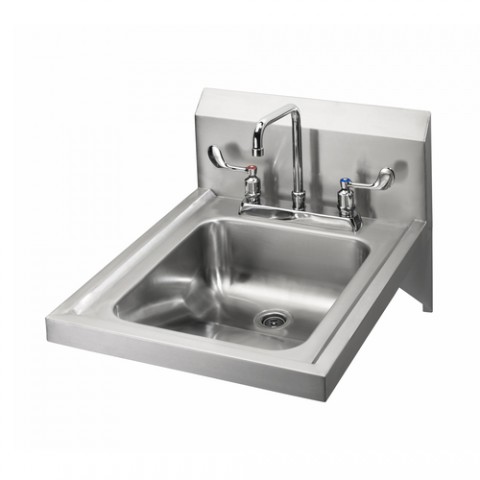 Hand Sink, wall mount, 14"W x 16" front-to-back x 5" deep bowl, 8" center deck mount faucet with wrist blades, 6" double bend spout, 1/4 turn ceramic valves, wall bracket with (2) side supports, 304 stainless steel construction, NSF, cCSAus, ADA Compliant