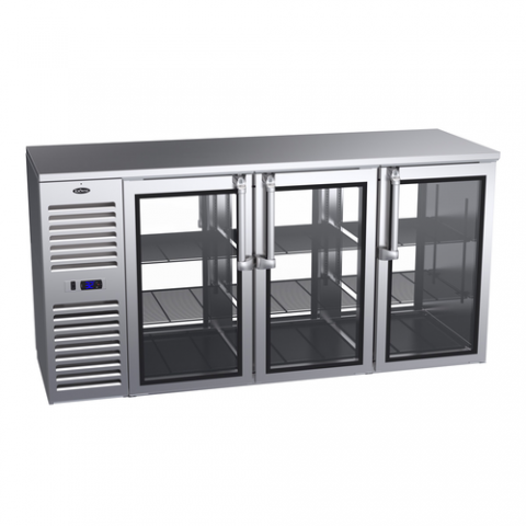 Pass-Thru Refrigerated Back Bar Cabinet, two-section, 72"W, self-contained refrigeration mounted on left, 30°F to 40°F temperature range, (6) hinged doors with locks, (2) adjustable wire shelves, (1) bottom rack per door, LED lighting, automatic defrost timer & condensate evaporator, stainless steel interior, R290 Hydrocarbon refrigerant, 1/4 HP, 115v/60/1-ph, 4.8 amps, cord with NEMA 5-15P, NSF7 Open Food Certified, ETL-Sanitation, ETLus