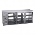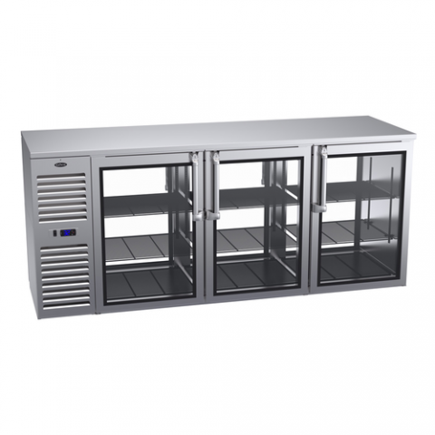 Pass-Thru Refrigerated Back Bar Cabinet, three-section, 84"W x 24"D, self-contained refrigeration mounted on left, 30°F to 40°F temperature range, (6) hinged doors with locks, (2) adjustable shelves & floor rack per door, digital thermostat, LED interior lights, includes condensate evaporator pan, stainless steel interior, R290 Hydrocarbon refrigerant, 1/3 HP, 115v/60/1-ph, 5.8 amps, cord with NEMA 5-15P, NSF7 Open Food Certified, ETL-Sanitation, ETLus