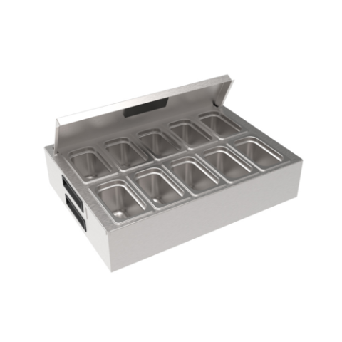 Krowne Chilled Garnish Station, fits all 24" x 24" drainboards, includes (10) stainless steel garnish cups, integrated removable ice pack, sliding cover for rear row, built-in handles, perforated insert, stainless steel construction, NSF