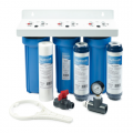 Krowne Hydrosift Triple Filter Assembly Kit - Includes triple filter assembly with mounting bracket, (2) cartridge filters, (1) sediment cartridge filter, (3) male to male nipple fittings, male to female ball valve, reducing bushing, female tee fitting, pressure gauge and filter wrench. 3/4” NPT water in and out connections, 8.0 GPM max flow rate, 20,000 gallon capacity, 20-100 PSI non-shock working pressure (1.38-6.89 bar), 35° - 160°F operating temperature