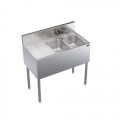 Royal Series Underbar Sink Unit, two compartment, 36"W x 19"D, 10" wide x 14" front-to-back x 10" deep compartments, 12" embossed integral drainboard on left, apron on front & sides, splash mount Royal Series faucet with swing spout (low lead compliant), (2) removable overflow standpipes, stainless steel top, front, & sides, stainless steel legs with adjustable thermoplastic bullet feet, NSF
