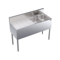 Royal Series Underbar Sink Unit, two compartment, 48"W x 19"D, 10" wide x 14" front-to-back x 10" deep compartments, 24" embossed drainboard on left, splash mount Royal Series faucet with swing spout, apron on front & sides, (2) removable overflow standpipes, stainless steel top, front, & sides, stainless steel legs with adjustable thermoplastic bullet feet, NSF
