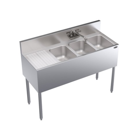 Royal Series Underbar Sink Unit, three compartment, 48"W x 19"D, 10" wide x 14" front-to-back x 10" deep compartments, 12" embossed integral drainboard on left, splash mount Royal Series faucet with swing spout, apron on front & sides, (3) removable overflow standpipes, stainless steel top, front, & sides, stainless steel legs with adjustable thermoplastic bullet feet, NSF