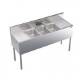 Royal Series Underbar Sink Unit, three compartment, 60"W x 19"D, 10" wide x 14" front-to-back x 10" deep compartments, 12" embossed integral drainboards on left & right, splash mount Royal Series faucet with swing spout, apron on front & sides, (3) removable overflow standpipes, stainless steel top, front, & sides, stainless steel legs with adjustable thermoplastic bullet feet, NSF