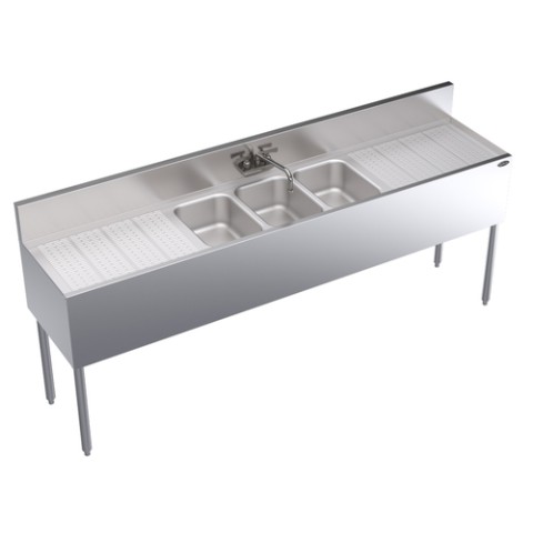 Royal Series Underbar Sink Unit, three compartment, 84"W x 19"D, 10" wide x 14" front-to-back x 10" deep compartments, 24" embossed integral drainboards on left & right, splash mount Royal Series faucet with swing spout, apron on front & sides, (3) removable overflow standpipes, stainless steel top, front, & sides, stainless steel legs with adjustable thermoplastic bullet feet, NSF
