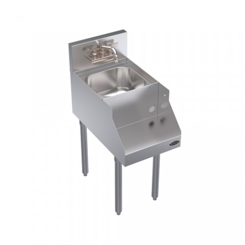 Royal Series Underbar Blender Station, with dump sink, 14"W x 24"D (to match speedrail depth), 7" deep sink bowl, splash mount Royal Series faucet, 9"D recessed blender shelf with utility box mounted underneath (GFCI receptacle required), stainless steel top, front, & sides, galvanized back & bottom, stainless steel legs with adjustable thermoplastic bullet feet, NSF