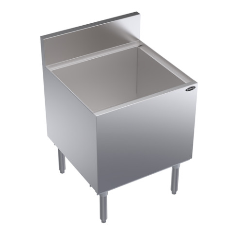 Royal Series Underbar Ice Bin/Cocktail Unit, built-in 10-circuit cold plate, 24"W x 24"D O.A., 121-lb capacity, 15" deep stainless steel bin liner, 3/4" x 3-1/2” Soda Line cut out in backsplash, 1/2" drain, stainless steel top, front & sides, galvanized steel back & bottom, stainless steel legs with adjustable thermoplastic bullet feet, NSF
