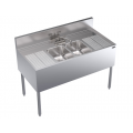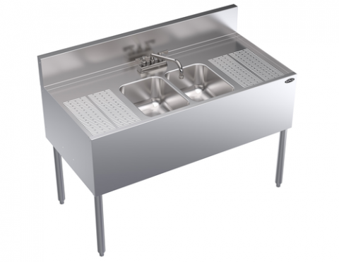 Royal Series Underbar Sink Unit, two compartment, 48"W x 24"D, 10" wide x 14" front-to-back x 10" deep compartments, 12" embossed drainboards on left & right, deck mount Royal Series faucet with swing spout, apron on front & sides, (2) removable overflow standpipes, stainless steel top, front, & sides, stainless steel legs with adjustable thermoplastic bullet feet, NSF