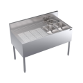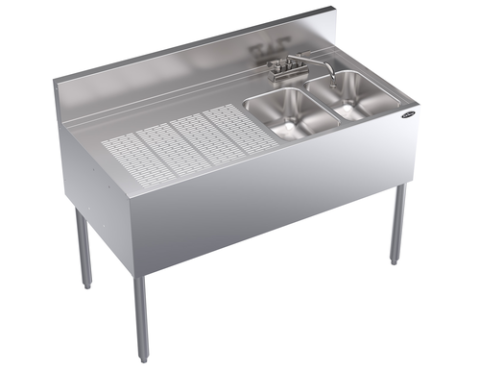 Royal Series Underbar Sink Unit, two compartment, 48"W x 19"D, 10" wide x 14" front-to-back x 10" deep compartments, 24" embossed drainboard on left, deck mount Royal Series faucet with swing spout, apron on front & sides, (2) removable overflow standpipes, stainless steel top, front, & sides, stainless steel legs with adjustable thermoplastic bullet feet, NSF