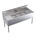 Royal Series Underbar Sink Unit, three compartment, 60"W x 24"D, 10" wide x 14" front-to-back x 10" deep compartments, 12" embossed integral drainboards on left & right, deck mount Royal Series faucet with swing spout, apron on front & sides, (3) removable overflow standpipes, stainless steel top, front, & sides, stainless steel legs with adjustable thermoplastic bullet feet, NSF