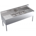 Royal Series Underbar Sink Unit, three compartment, 72"W x 24"D, 10" wide x 14" front-to-back x 10" deep compartments, 18" embossed integral drainboards on left & right, deck mount Royal Series faucet with swing spout, apron on front & sides, (3) removable overflow standpipes, stainless steel top, front, & sides, stainless steel legs with adjustable thermoplastic bullet feet, NSF