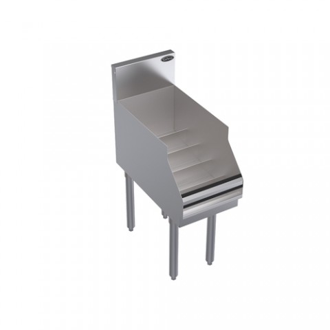 Royal Series Underbar Liquor Display, freestanding, space maximizing design, 12"W x 24"D, (5) bottle steps with guard rails, (15) bottle capacity, stainless steel top, front, & sides, galvanized steel back & bottom, stainless steel legs with adjustable thermoplastic bullet feet, NSF