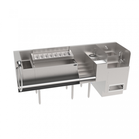 The Taffer Command Station by Krowne - 80"W x 24" deep, 36-1/2" overall height, from left to right: 4" soda gun holder, 8"W insulated bottle section, 30"W ice bin, 15" deep liner with built in 10 circuit cold plate, (1) ice bin divider, garnish tray/sliding cover, 12"W five-step liquor display, 8" speed station with non-slip cutting board, rinser, and tool well with faucet (pressure regulator included), 18" Hybrid Hand/Dump Sink with Soap and Paper Towel Dispenser, 42" sound deadened single speedrail, stainless steel top, front, & sides, stainless steel legs with adjustable thermoplastic bullet feet, NSF