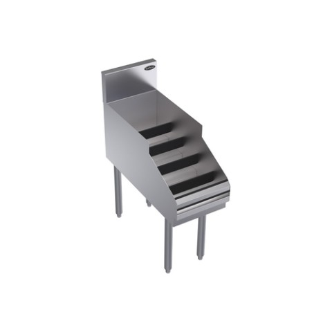 Royal Series Underbar Liquor Bottle Display Unit, freestanding, 12"W x 29"D (to match double speedrail depth), holds (15) liquor bottles, (5) bottle steps with side splashes, stainless steel top, front, & sides, galvanized steel back & bottom, stainless steel legs with adjustable thermoplastic bullet feet, NSF