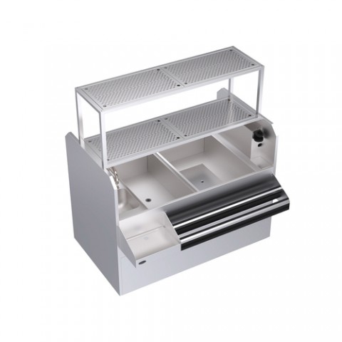 Royal Series Underbar Ice Bin/Cocktail Station, pass-thru combo, 60"W x 45"D x 45"H, 24"W pass-thru ice bin on right with 10-circuit cold plate, 42"W double speedrail, 18"W insulated bottle storage in center, (2) dump sinks on left with (1) deck mount Royal Series gooseneck faucet (low lead compliant), 16"W blender shelf with duplex outlet, 18"D glass shelf with perforated insert & drain, includes 4" tubing chase with soda gun holder, stainless steel side panels, stainless steel legs with grey plastic bullet feet, NSF