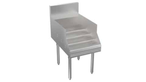 Stadium Series Underbar Liquor Bottle Display Unit, freestanding, 12"W x 29"D holds (12) liquor bottles, (4) bottle steps with guard rails, stainless steel construction, stainless steel legs with adjustable bullet feet, 5” deep backsplash return to allow for utilities to be run directly behind equipment, increase equipment overall depth by 5"