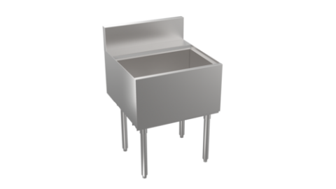 Stadium Series Underbar Ice Bin/Cocktail Unit, built-in 10-circuit cold plate, 24"W x 19"D, 74-lbs ice capacity, 12" deep stainless steel bin liner, 3/4" x 3-1/2” Soda Line cut out in backsplash, 1/2" drain, stainless steel top, front & sides, galvanized steel back & bottom, stainless steel legs with adjustable thermoplastic bullet feet, NSF