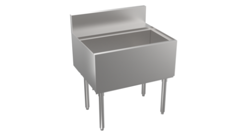 Stadium Series Underbar Ice Bin/Cocktail Unit, built-in 10-circuit cold plate, 30"W x 19"D, 92-lbs ice capacity, 12" deep stainless steel bin liner, 3/4" x 3-1/2” Soda Line cut out in backsplash, 1/2" drain, stainless steel construction, stainless steel legs with adjustable bullet feet, 5” deep backsplash return to allow for utilities to be run directly behind equipment, increase equipment overall depth by 5"