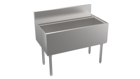 Stadium Series Underbar Ice Bin/Cocktail Unit, 42"W x 19"D, 129-lbs ice capacity, 12" deep stainless steel bin liner, 1" drain, stainless steel construction, stainless steel legs with adjustable bullet feet, 5” deep backsplash return to allow for utilities to be run directly behind equipment, increase equipment overall depth by 5"F