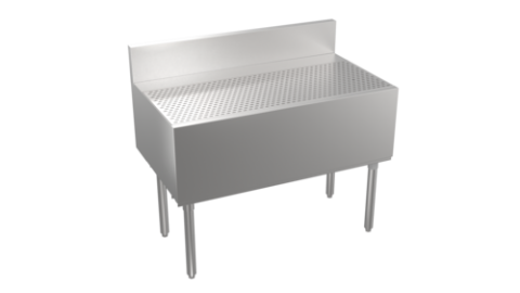 Stadium Series Underbar Drainboard, free standing, 42"W x 29"D, embossed top with 1" drain, stainless steel construction, stainless steel legs with adjustable bullet feet, 5” deep backsplash return to allow for utilities to be run directly behind equipment, increase equipment overall depth by 5"