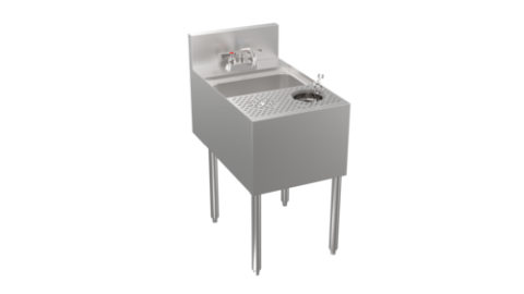 Stadium Series Underbar Speed Unit, 18”W x 24”D, 10” x 14” x 7” deep sink bowl, splash mount Stadium Series faucet, high performance push-down glass rinser faucet with pressure regulator, 6” diameter tool well with faucet, removable perforated top, stainless steel construction, stainless steel legs with adjustable bullet feet, 5” deep backsplash return to allow for utilities to be run directly behind equipment, increase equipment overall depth by 5"