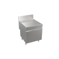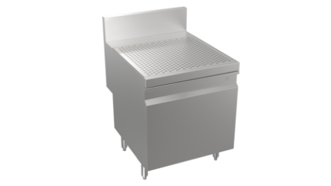 Stadium Series Underbar Drainboard with open cabinet base, 24"W x 29"D, embossed drainboard top, open front cabinet base, stainless steel construction, stainless steel legs with adjustable bullet feet, 5” deep backsplash return to allow for utilities to be run directly behind equipment, increase equipment overall depth by 5", (Midshelf optional, not standard)