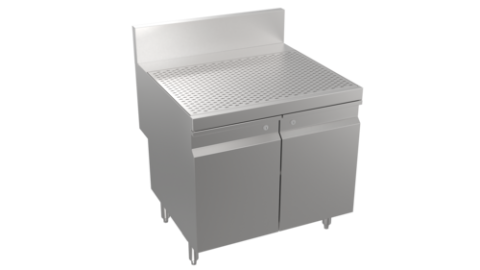 Stadium Series Underbar Drainboard with open cabinet base, 30"W x 29"D, embossed drainboard top, open front cabinet base, stainless steel construction, stainless steel legs with adjustable bullet feet, 5” deep backsplash return to allow for utilities to be run directly behind equipment, increase equipment overall depth by 5", (Midshelf optional, not standard)