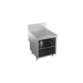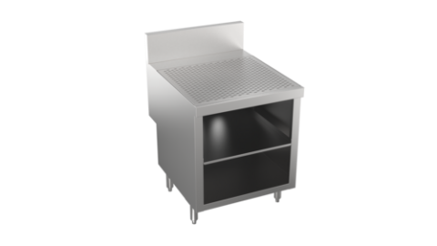 Stadium Series Underbar Drainboard with cabinet base & locking hinged door, 24"W x 24"D, embossed drainboard top, stainless steel construction, stainless steel legs with adjustable bullet feet, 5” deep backsplash return to allow for utilities to be run directly behind equipment, increase equipment overall depth by 5", (Midshelf optional, not standard)