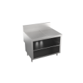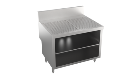 Stadium Series Underbar Drainboard with cabinet base & locking hinged door, 36"W x 24"D, embossed drainboard top, stainless steel construction, stainless steel legs with adjustable bullet feet, 5” deep backsplash return to allow for utilities to be run directly behind equipment, increase equipment overall depth by 5", (Midshelf optional, not standard)
