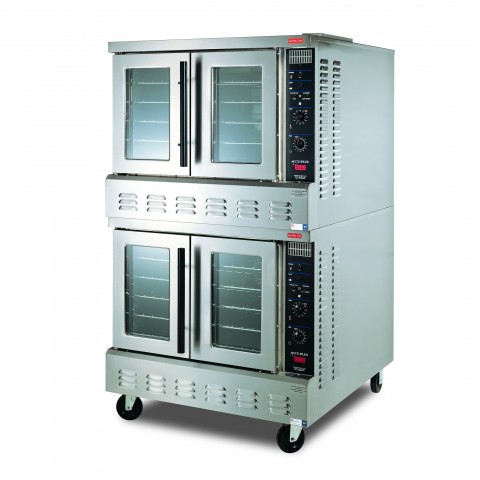 Strato Series™ Convection Oven, gas, bakers depth, 2-deck, 150-450°F range solid state controls & timer, high power radial fan, 11 position pan slides, 5 racks, per deck, porcelainized interior, simultaneously opening doors with double pane glass windows, stainless steel exterior, (2) 60,000 BTU, 120V/60/1-ph, 14.2 amps, 1.0kW, cULus, NSF, Made in USA