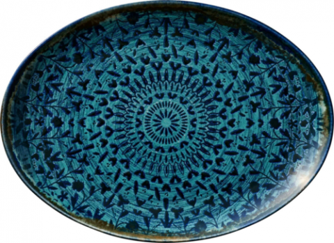 Platter, 13-3/4”L x 5-7/8”W x 1”H, oval, dishwasher safe, microwave safe, oven safe, vitrified china, bold blue and black pattern, Mirage (6 each per case)