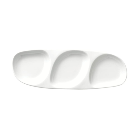 (Formerly Syracuse China) Tray, (3) 3-1/2 oz. compartments, 13-3/4" x 5", oval, highly polished foot, porcelain, Microban® fully vitrified glaze, Rigel™ pattern & shape, Constellation™, Lunar White™ body color (12 each per case)