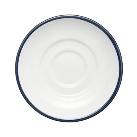 (Formerly Syracuse China) Saucer, 6" dia. x 1"H, round, highly polished foot, porcelain, Microban® fully vitrified glaze, Rigel™ Banded pattern & shape, Constellation™, Lunar White™ body color, steel blue band (36 each per case)