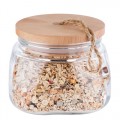 Canister, 33-7/8 oz., 5-5/8" dia. x 4-3/8"H, round, wooden lid with silicone gasket & rope pull, dishwasher safe, glass body, clear, Woody, APS® Germany (12 each per case)