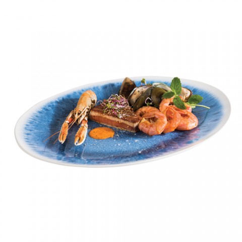 Tray, 19"L x 14"W x 1-1/4"H, oval, stackable, dishwasher safe, melamine, blue/white, Blue Ocean, APS® Germany (6 each per case)