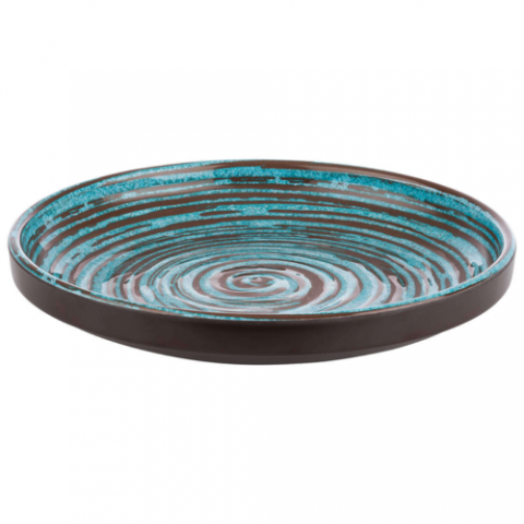 Cancun Plate, 9" dia. x 1-3/8"H, round, high rim, stackable, scratch & shock proof, acid resistant, dishwasher safe, melamine, brown/blue spiral pattern, APS Germany (6 each per case)