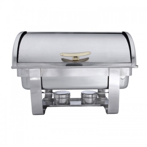 European Chafer, full size, 9 qt., roll top, satin finish stainless steel, welded frame, brass accented handles & trim