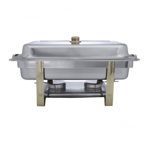 Riviera Chafer, full size, 9 qt., rectangular, lift off, gold trim, stainless steel, mirror polished with gold accented legs, handles, knobs & frame, includes water pan, food pan, cover and two stainless fuel holders