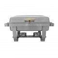 European Chafer, full size, 9 qt., rectangular, hinged mirror polished dome cover, heavy duty frame, with water pan, food pan, & two stainless fuel holders, accented with gold end handles and gold center lift handle