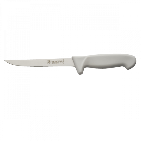 Gladiator Boning Knife, 8", stiff, hand honed edge, forged, high carbon stainless steel, plastic handle, white, NSF (clam packed)