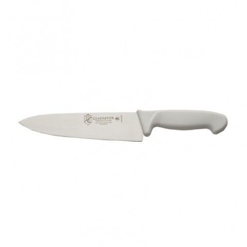 Gladiator Chef's/Cook's Knife, 8", hand honed edge, forged, high carbon stainless steel, plastic handle, white, NSF (clam packed)