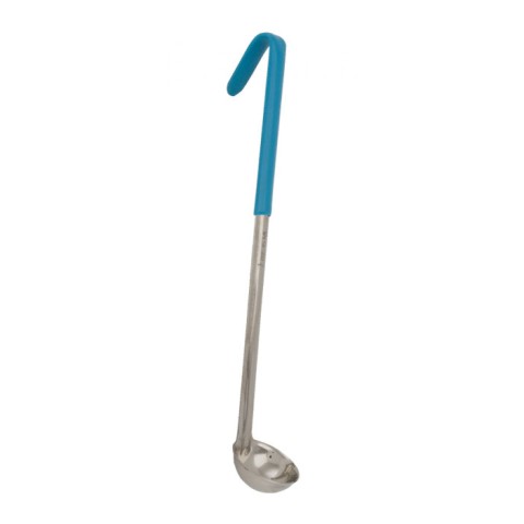 Ladle, 1 oz., 10" handle, 11-3/4" overall length, one-piece, capacity marked on handle, stainless steel, PVC coated handle, yellow