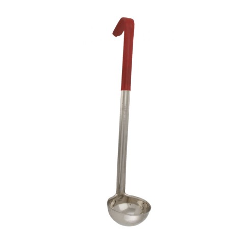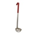 Ladle, 2 oz., 10" handle, 11-3/4" overall length, one-piece, capacity marked on handle, stainless steel, PVC coated handle, red