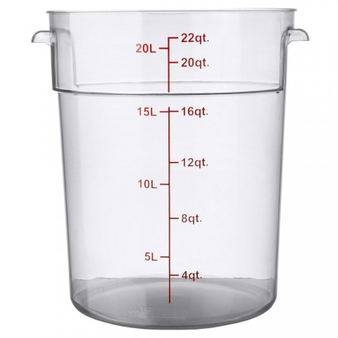 Storage Container, 22 qt., 14"W x 12-3/8"D x 15"H, round, with handles, graduation markings in quarts & liters, polycarbonate, clear, NSF