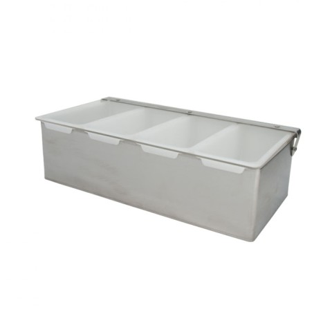 Condiment Dispenser, 12-1/4" x 6" x 3-5/8"H, 4 compartment, stainless steel base, "see thru" acrylic cover, prop up lid