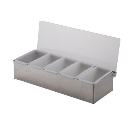 Condiment Dispenser, 15-1/4" x 6" x 3-5/8"H, 5 compartment, stainless steel base, "see thru" acrylic cover, prop up lid