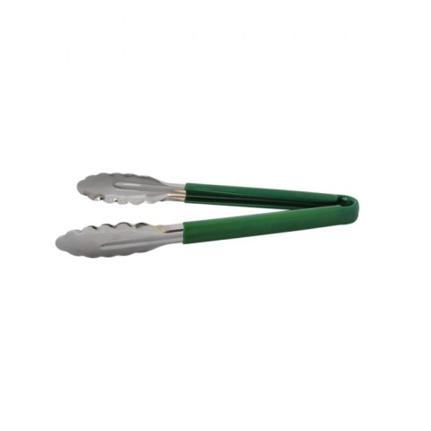 Tongs, 9", stainless steel, plastic coated handle, green