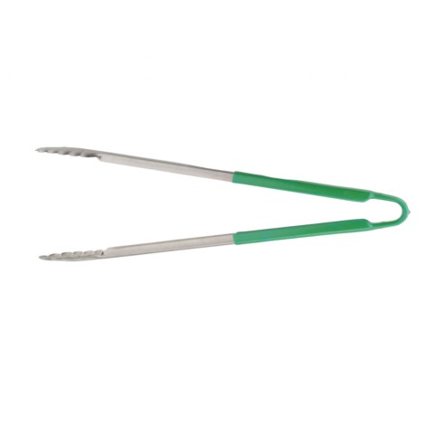 Tongs, 16", stainless steel, plastic coated handle, green