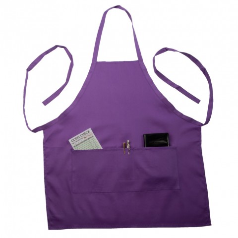 Bib Apron, 28-1/2" x 27", (2) 7" x 7" pockets, (1) 3" x 7" pencil pocket, 32" cloth ties, 65/35 poly/cotton twill, purple (individually packaged with barcode)